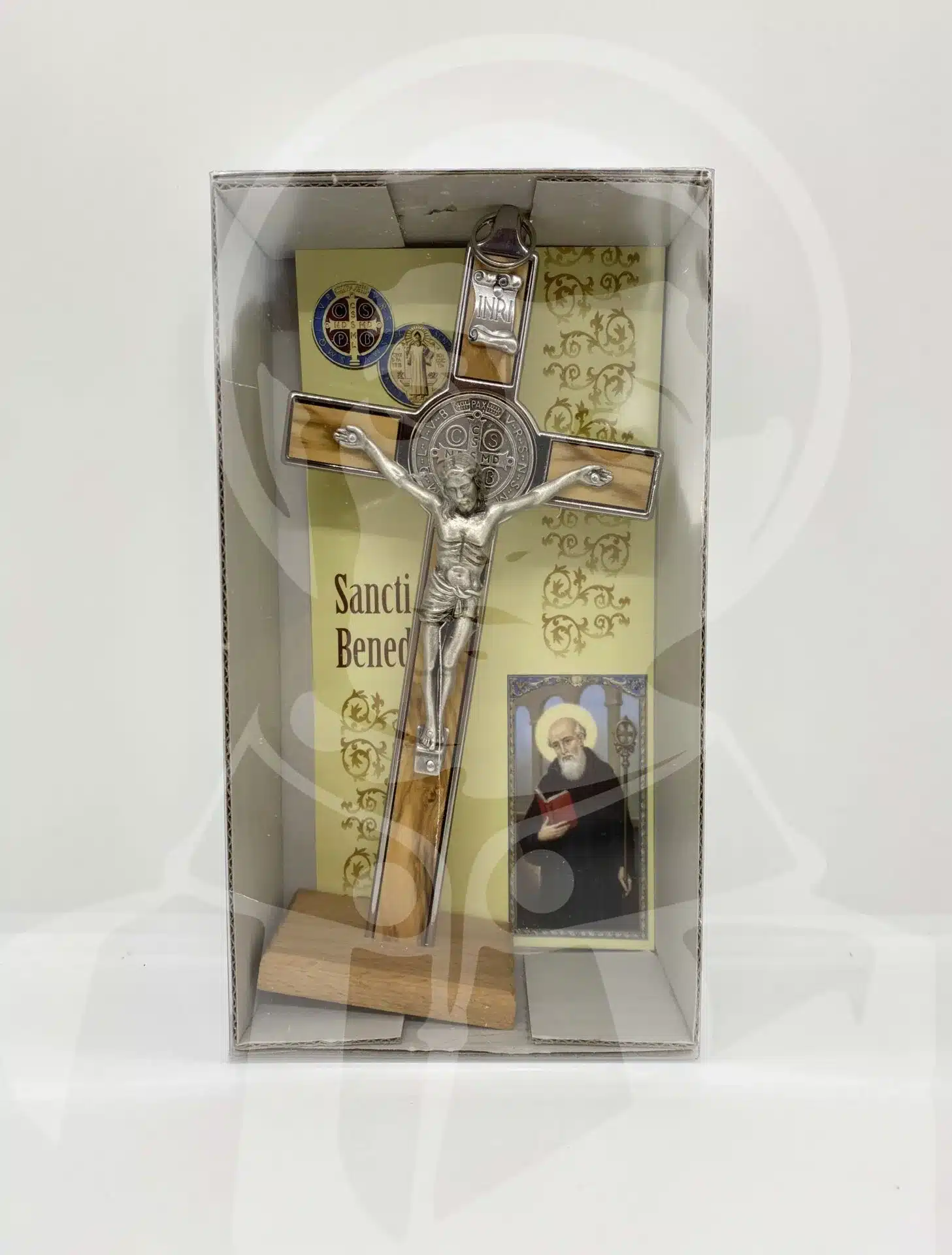 Crucifixo São Bento de Madeira de Oliveira e Metal Nikel