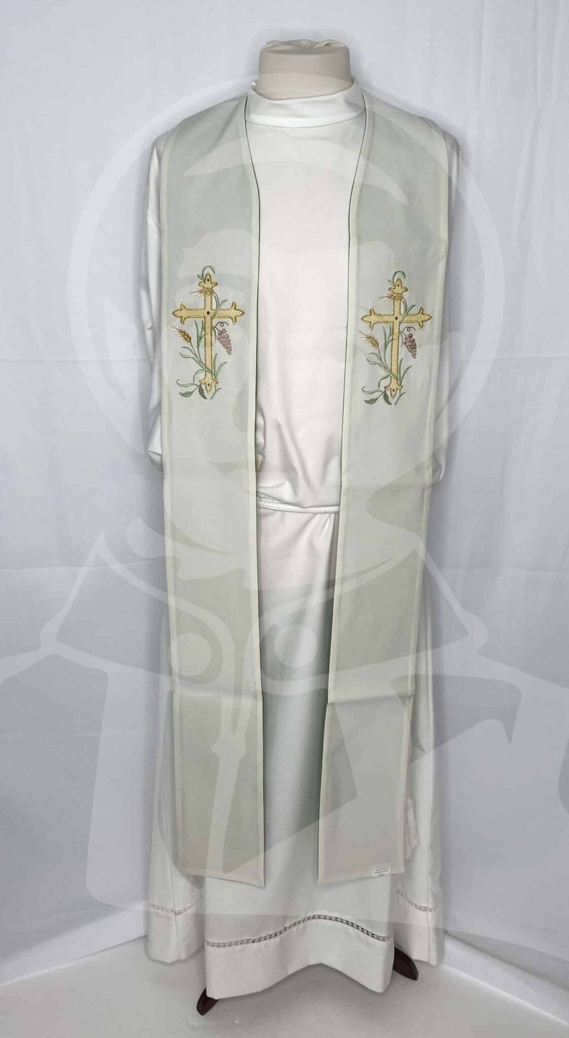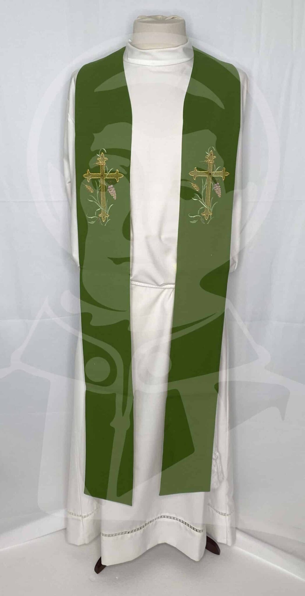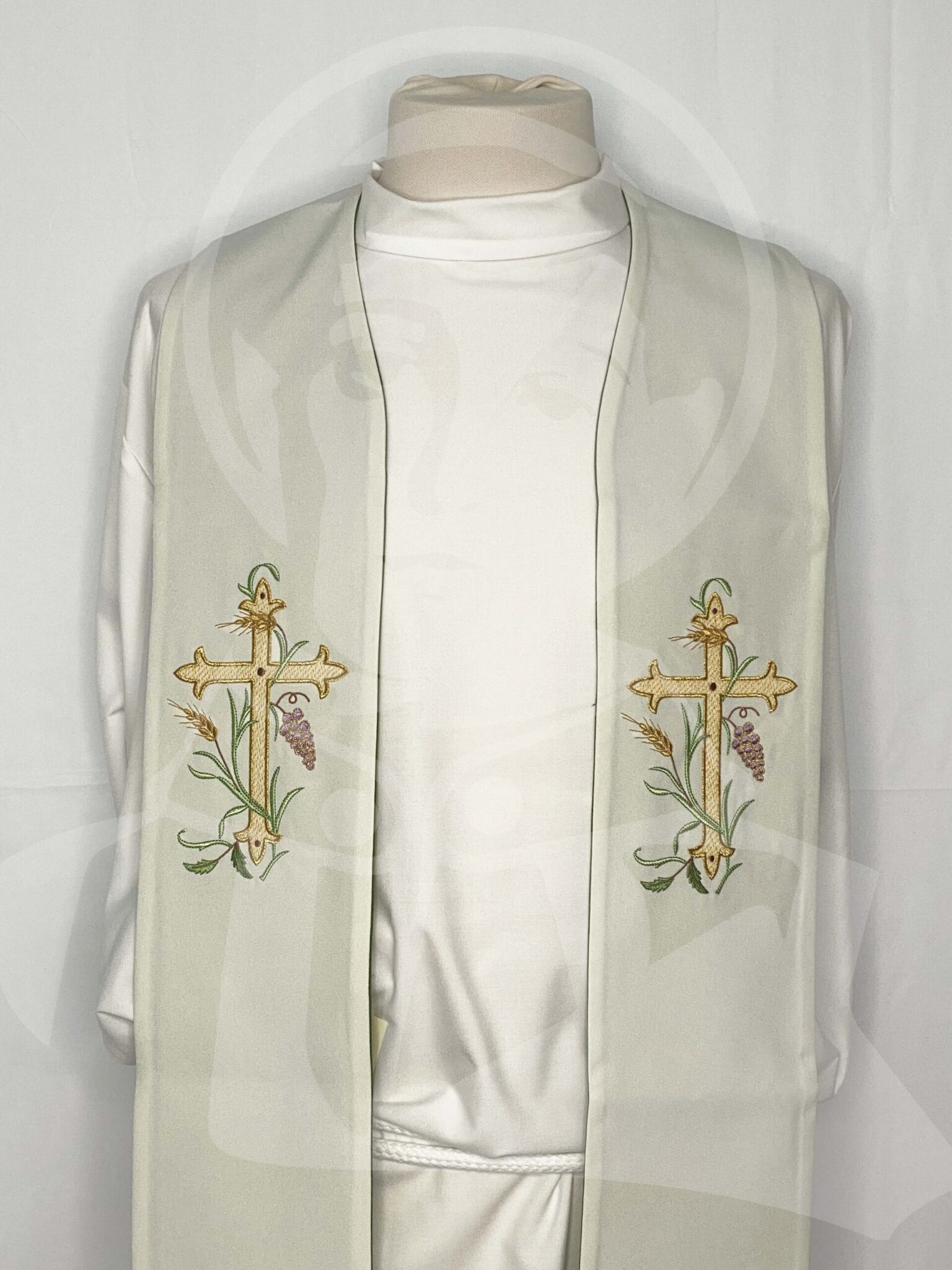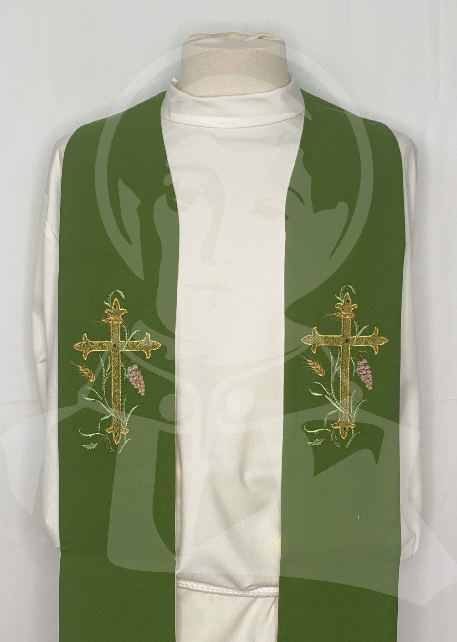 Estola Dupla com Bordado de Cruz, Espigas e Uvas Verde/Branco