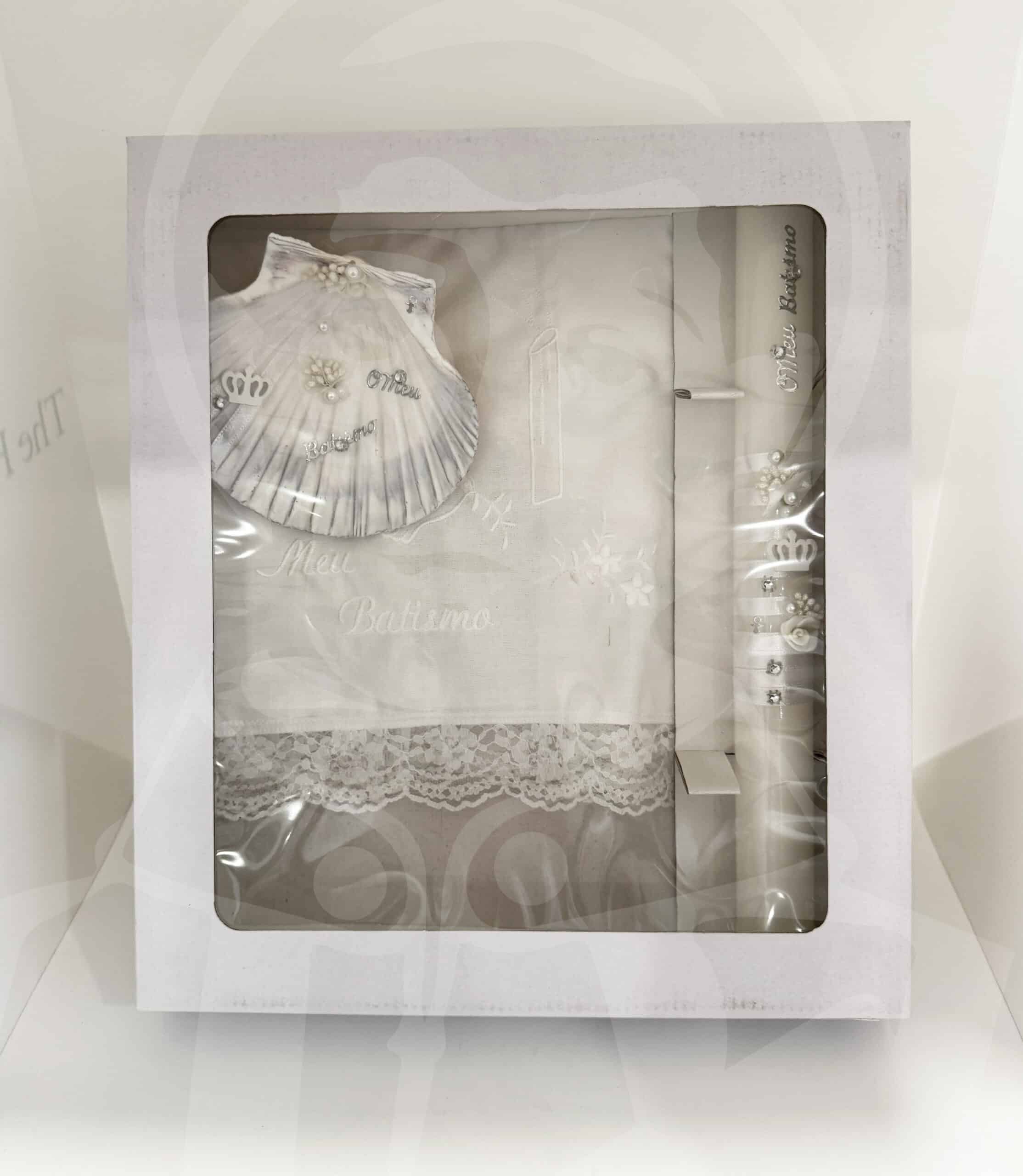 Kit de Batismo com Vela, Concha e Toalha – Branco