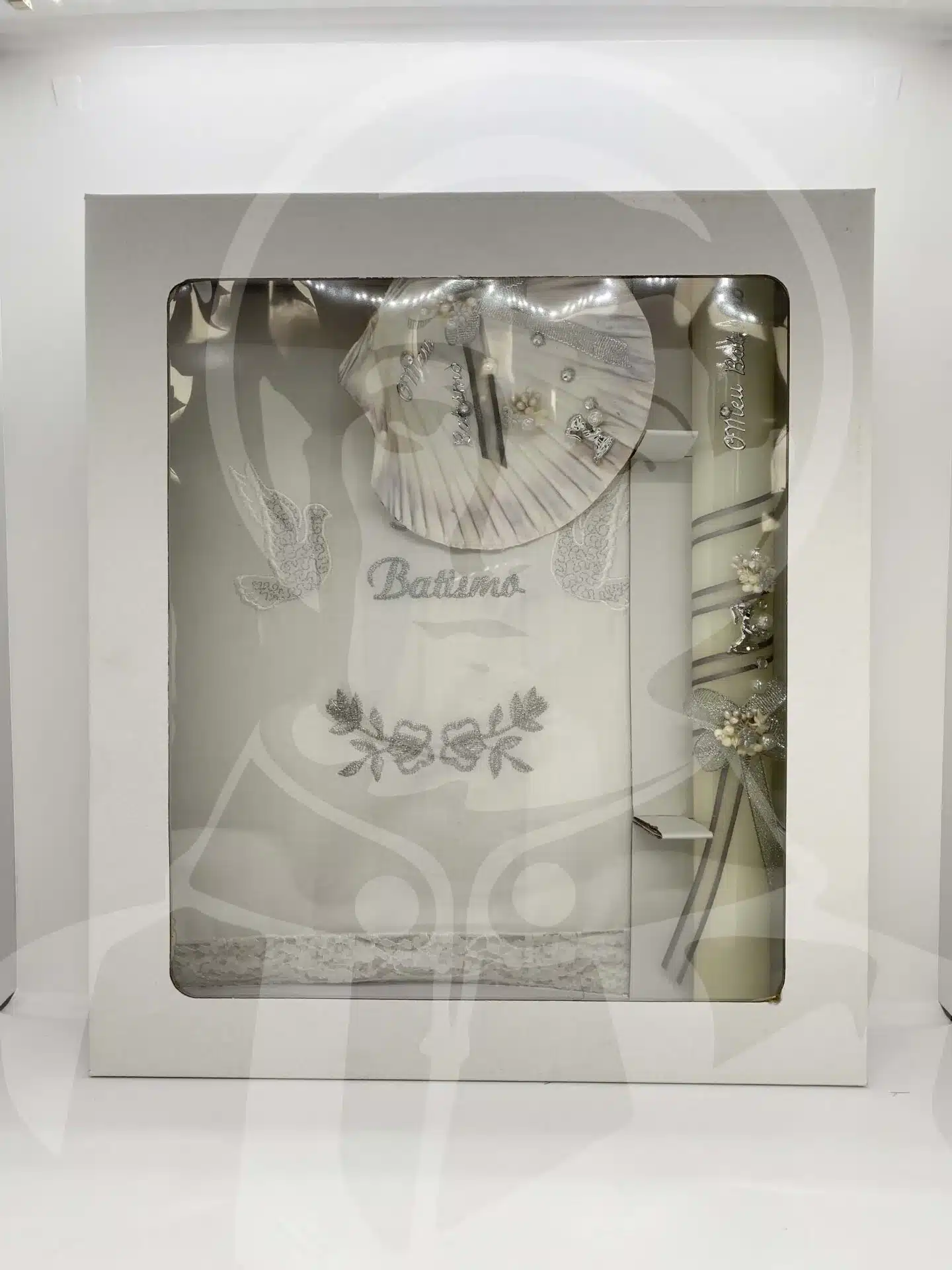 Kit de Batismo com Vela, Concha e Toalha – Prateado